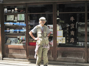 柴田さんがこの通りにある牛窪商店の中を覗いておりました。御年80歳を超えているとは思えないダンディ振りです。昭和ロマンのモダンボーイ(当時はモボと呼んだようです)というところでしょうか。 |